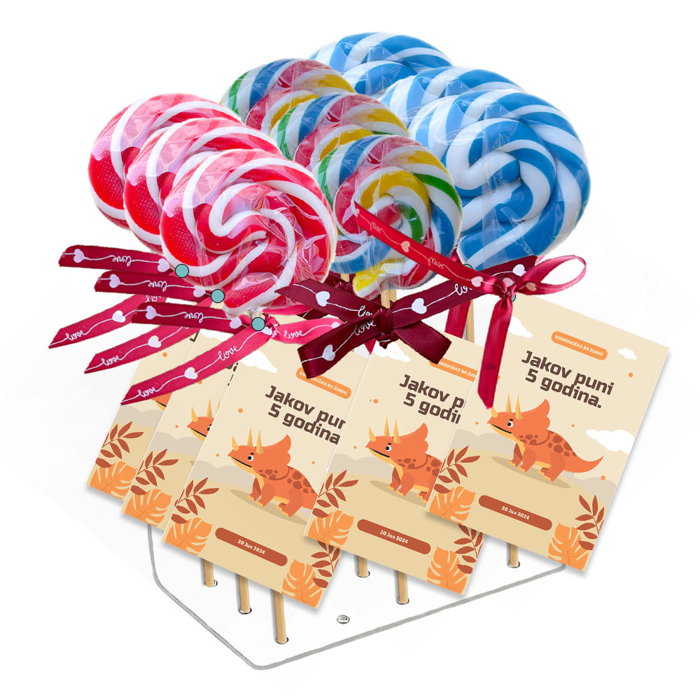 Naše personalizovane poklon lizalice swirl su savršen izbor za dekoraciju rođendana vašeg deteta! Ove predivne lizalice dolaze u raznim bojama i mogu biti personalizovane imenom slavljenika. Savršene su za slatki sto, a takođe su i odličan poklon za goste. Učinite rođendan vašeg deteta posebnim sa ovim šarenim i ukusnim lizalicama koje će sigurno oduševiti sve prisutne.